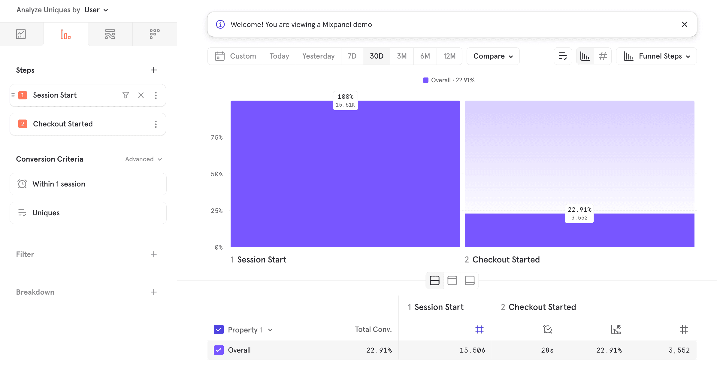 This example uses our E-Commerce demo dataset and shows how you can use Sessions in our funnels report: